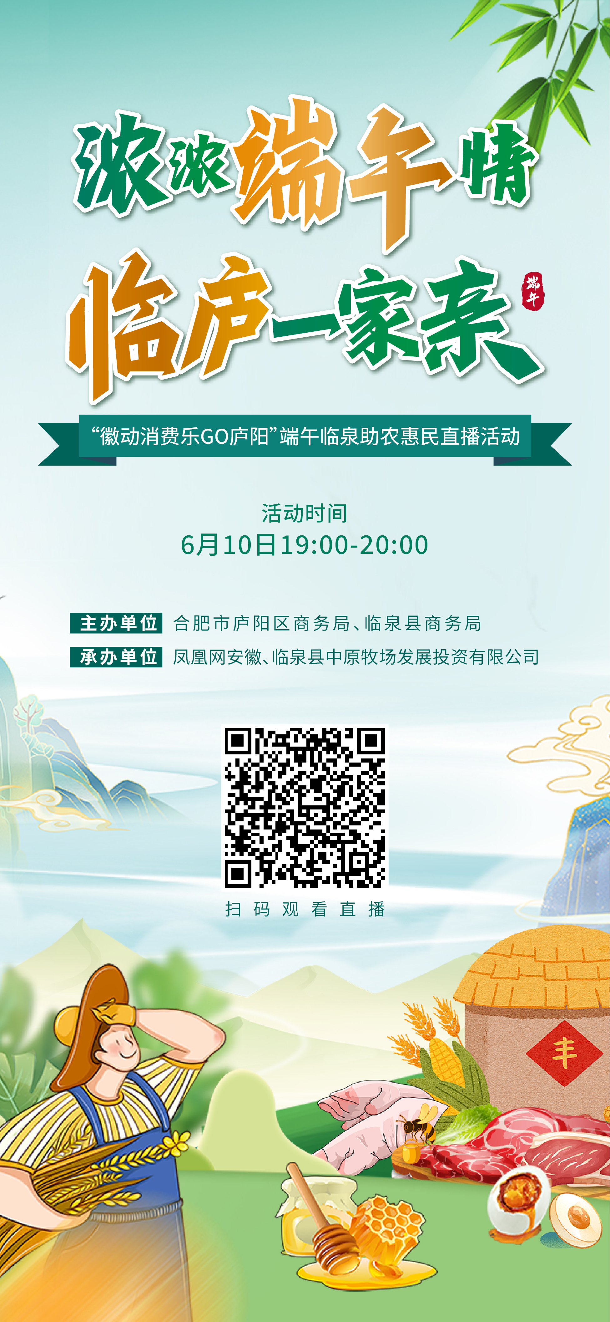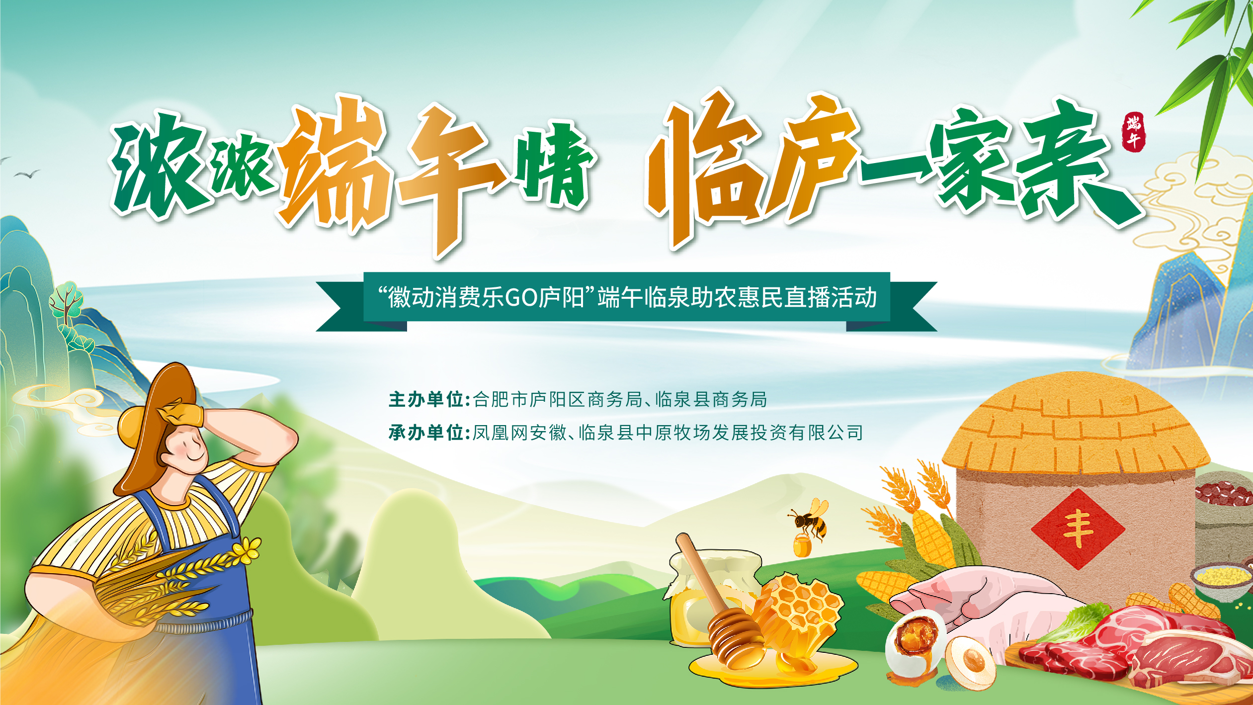 为积极助力乡村振兴,促进农产品消费,带动农民增收,由合肥市庐阳区商务局、阜阳市临泉县商务局主办,凤凰网安徽、临泉县中原牧场发展投资有限公司承办的“徽动消费乐GO庐阳”端午临泉助农惠民直播活动将于6月10日清新来袭!