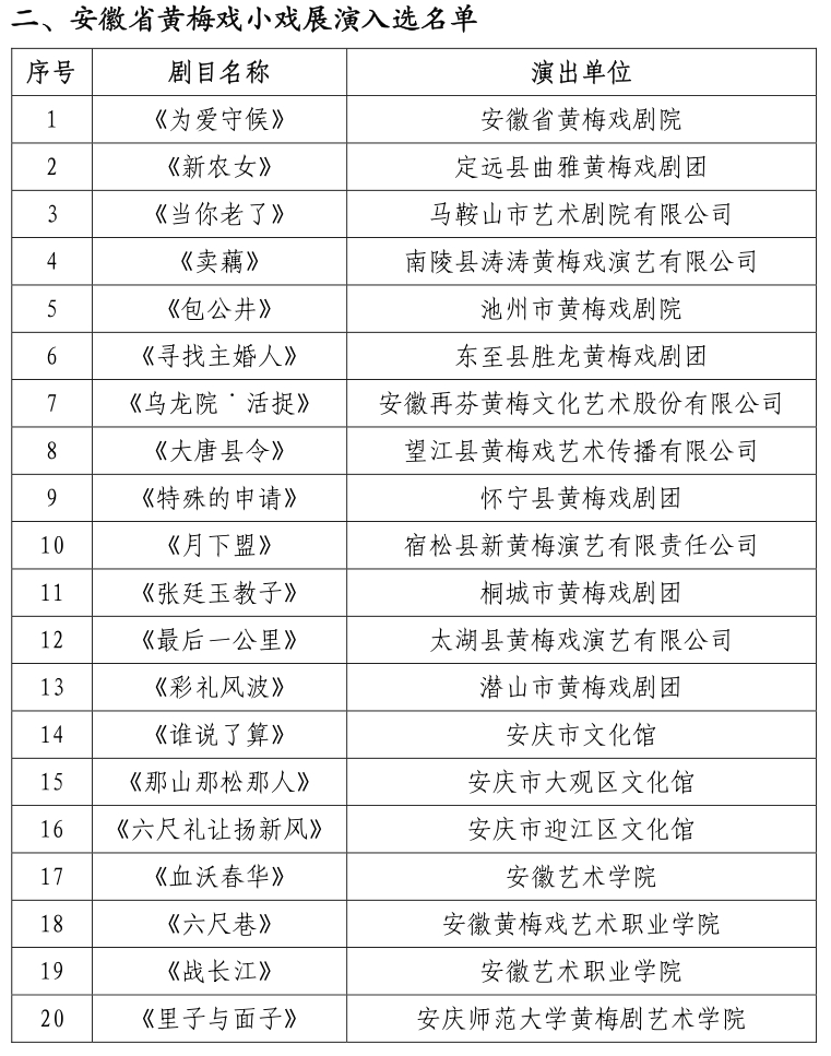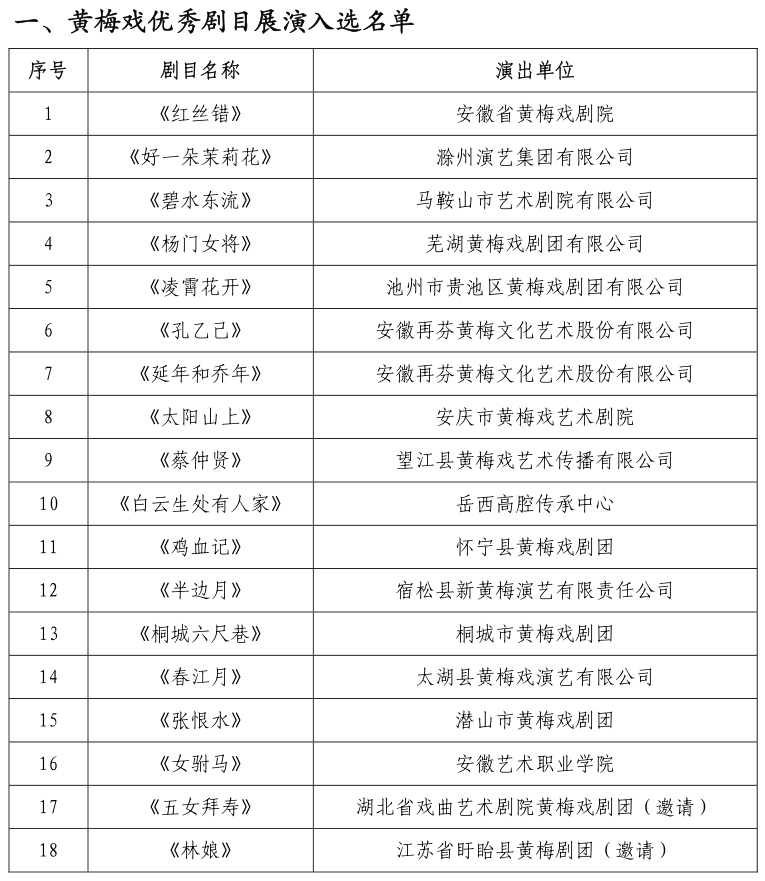 由安徽省文化和旅游厅、安庆市人民政府主办的2025年安庆市“十一”黄梅戏展演周将于2025年9月26日至10月8日举行,戏曲展演的申报、邀请和专家遴选工作已经结束。黄梅戏优秀剧目展演组织16台安徽省内黄梅戏优秀剧目和2台邀请剧目(江苏省、湖北省)演出,每台演出1场;安徽省黄梅戏小戏展演由20个小戏组成3台演出,每台演出1场。