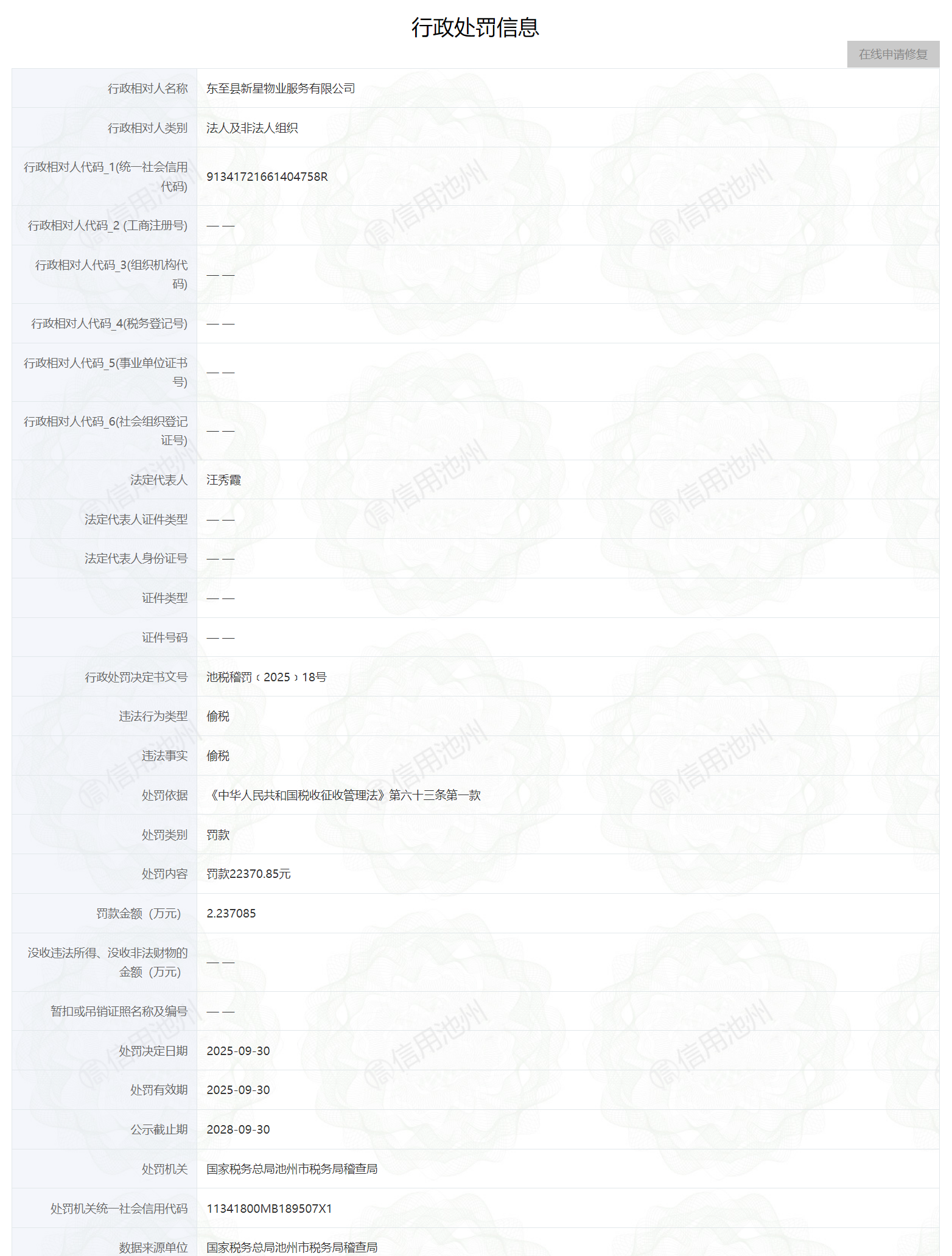 近日,信用池州披露行政处罚信息,东至县新星物业服务有限公司偷税被罚款2.237085万元,行政处罚决定书文号为池税稽罚﹝2025﹞18号。