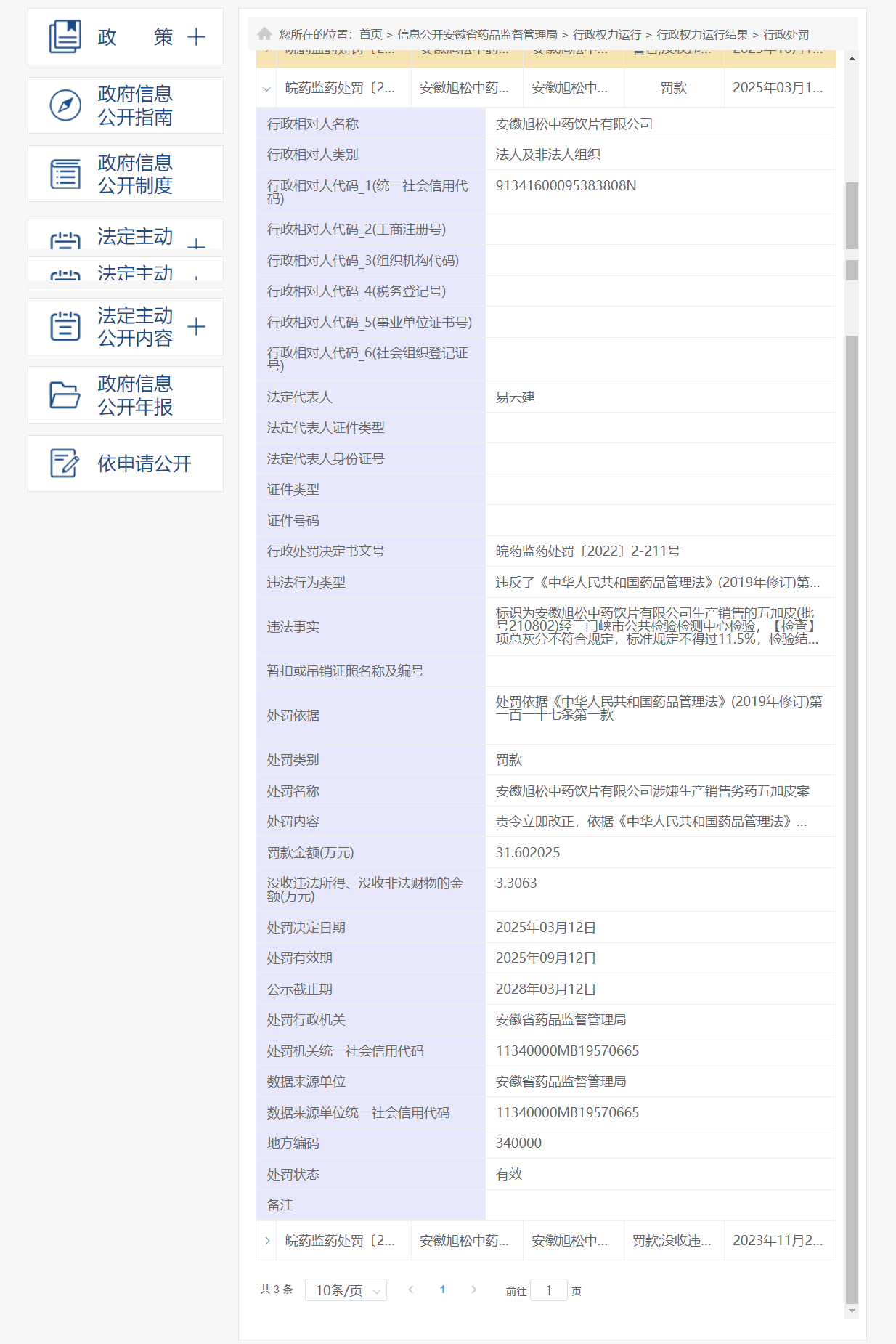 往期行政处罚信息显示,2025年3月12日,安徽旭松中药饮片有限公司生产销售劣药五加皮被罚31.602025万元。
