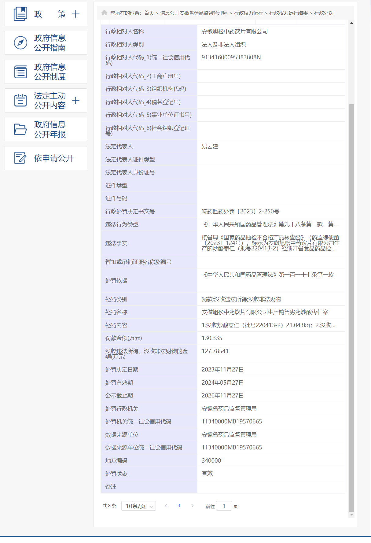 2023年,该公司因生产销售劣药炒酸枣仁,被罚款130.335万元,没收违法所得127.78541万元。该处罚有效期至2024年5月27日。