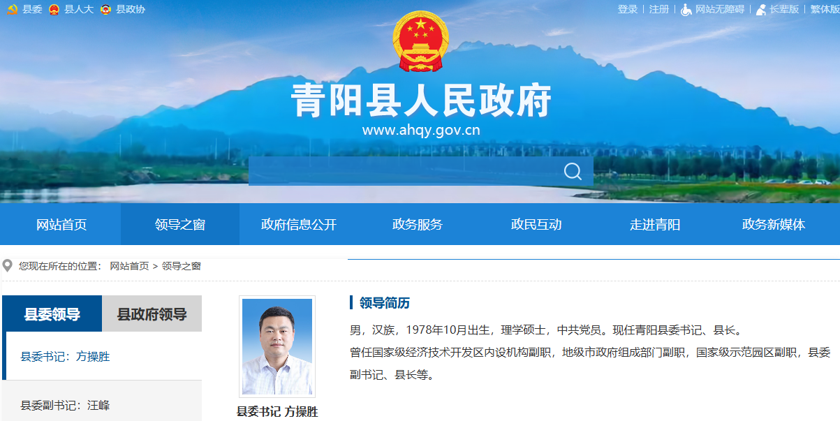 据池州市青阳县政府网站“领导之窗”更新显示,方操胜已任青阳县委书记。