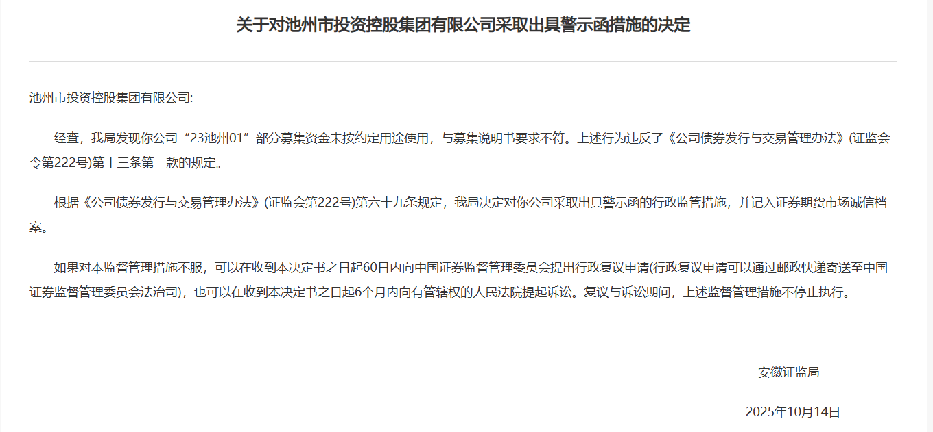 9月24日,安徽证监局网站披露行政监管措施信息,因“23池州01”部分资金未按约定用途使用,与募集说明书要求不符,池州市投资控股集团有限公司被出具警示函。