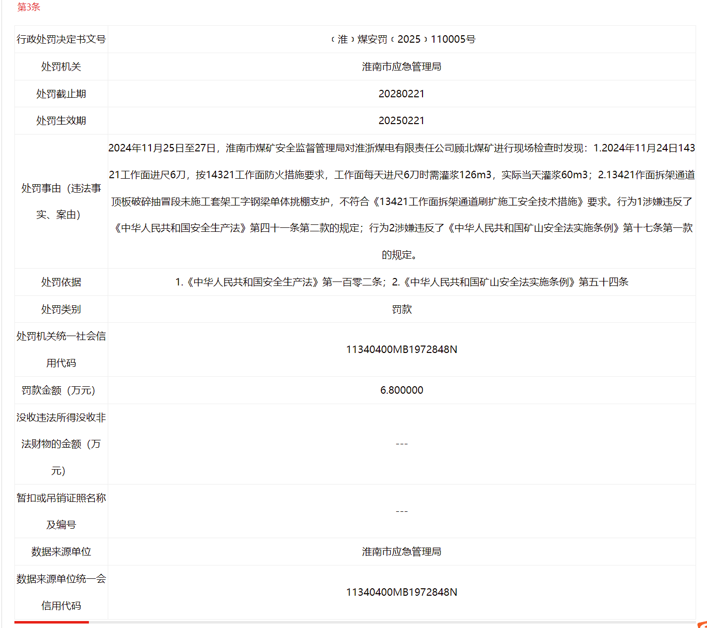 近日,信用淮南披露行政处罚信息,因存在安全生产隐患,淮浙煤电有限责任公司顾北煤矿被罚款3.9万元,行政处罚决定书文号为﹝淮﹞煤安罚﹝2025﹞110012号。