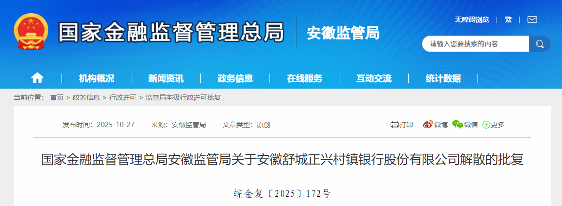 近日,安徽金融监管局批复,同意解散安徽舒城正兴村镇银行股份有限公司。原文如下: