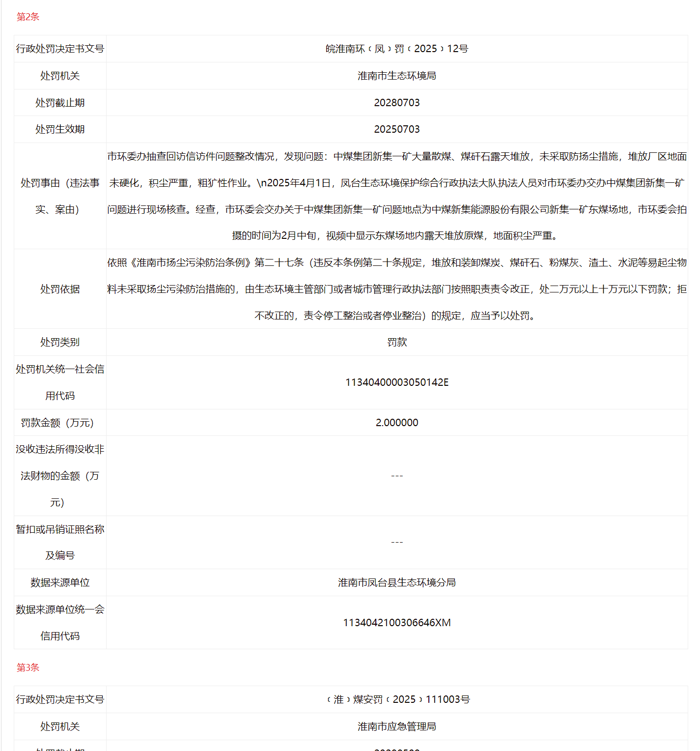 今年7月3日,该单位被罚款2万元,处罚事由为因大量散煤、煤矸石露天堆放,未采取防扬尘措施,堆放厂区地面未硬化,积尘严重,粗犷性作业。行政处罚决定书文号为皖淮南环﹝凤﹞罚﹝2025﹞12号。