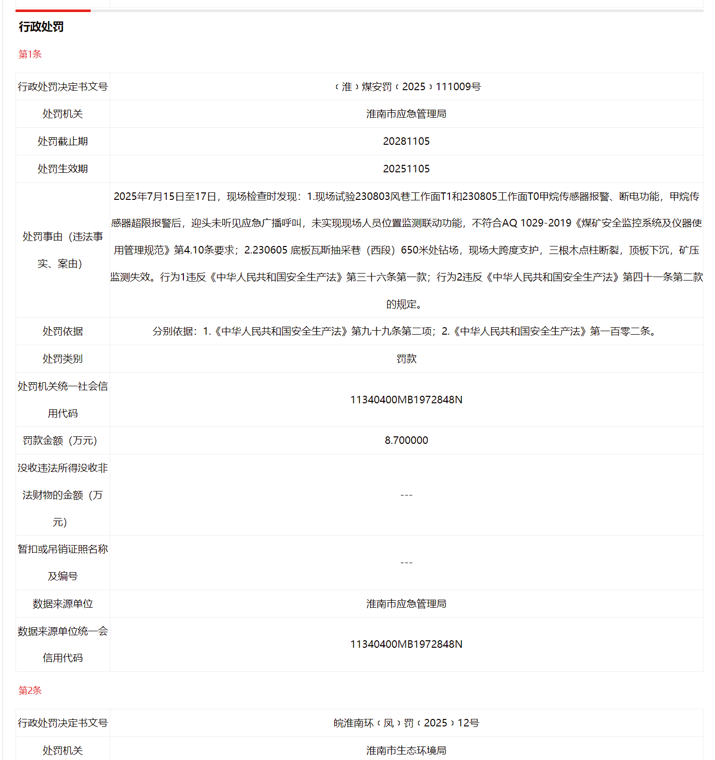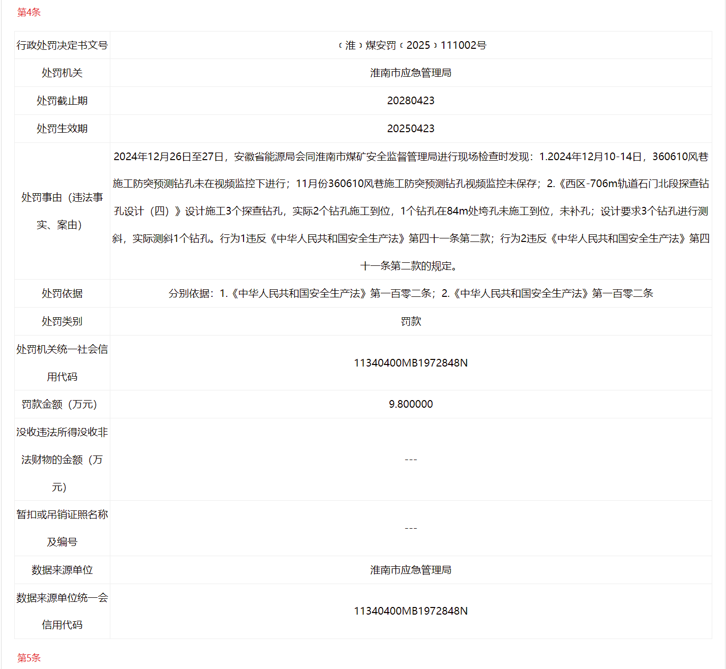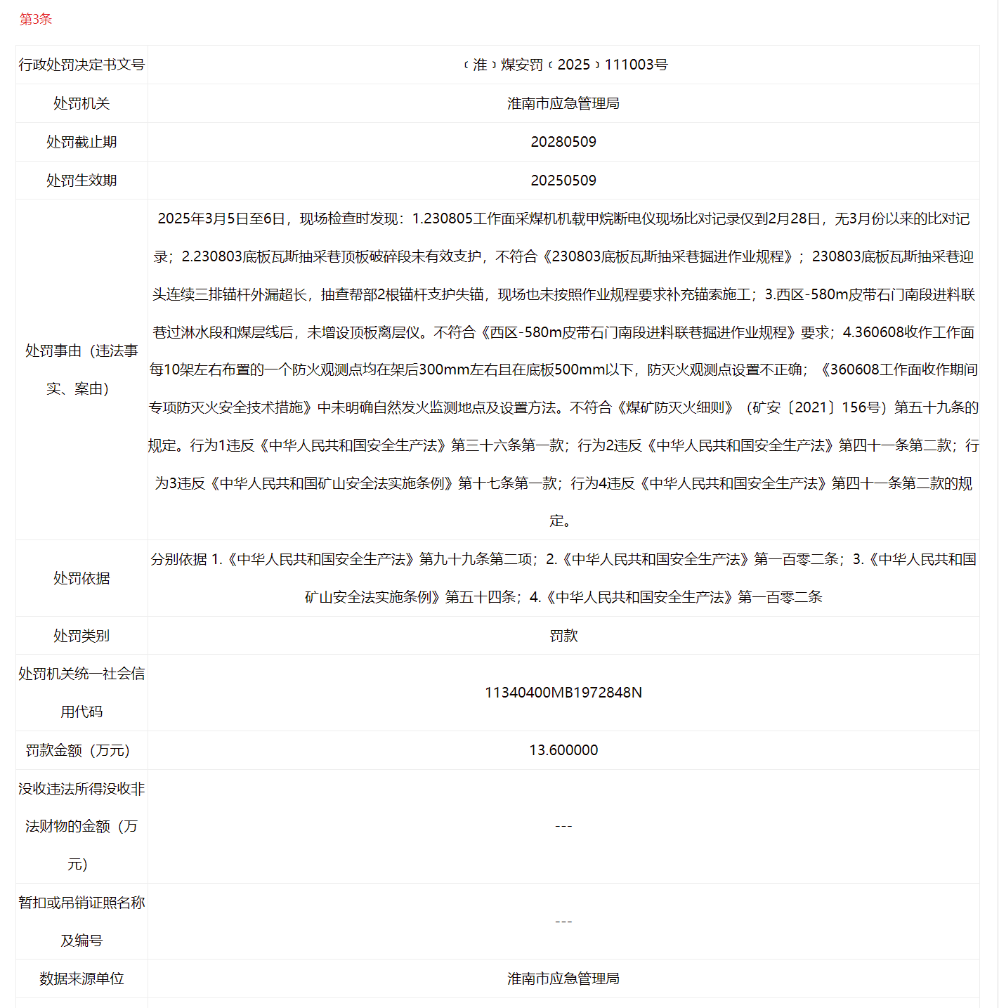 今年5月9日,该单位因涉4项安全生产违法违规行为,被处罚款13.6万元,行政处罚决定书文号为﹝淮﹞煤安罚﹝2025﹞111003号。