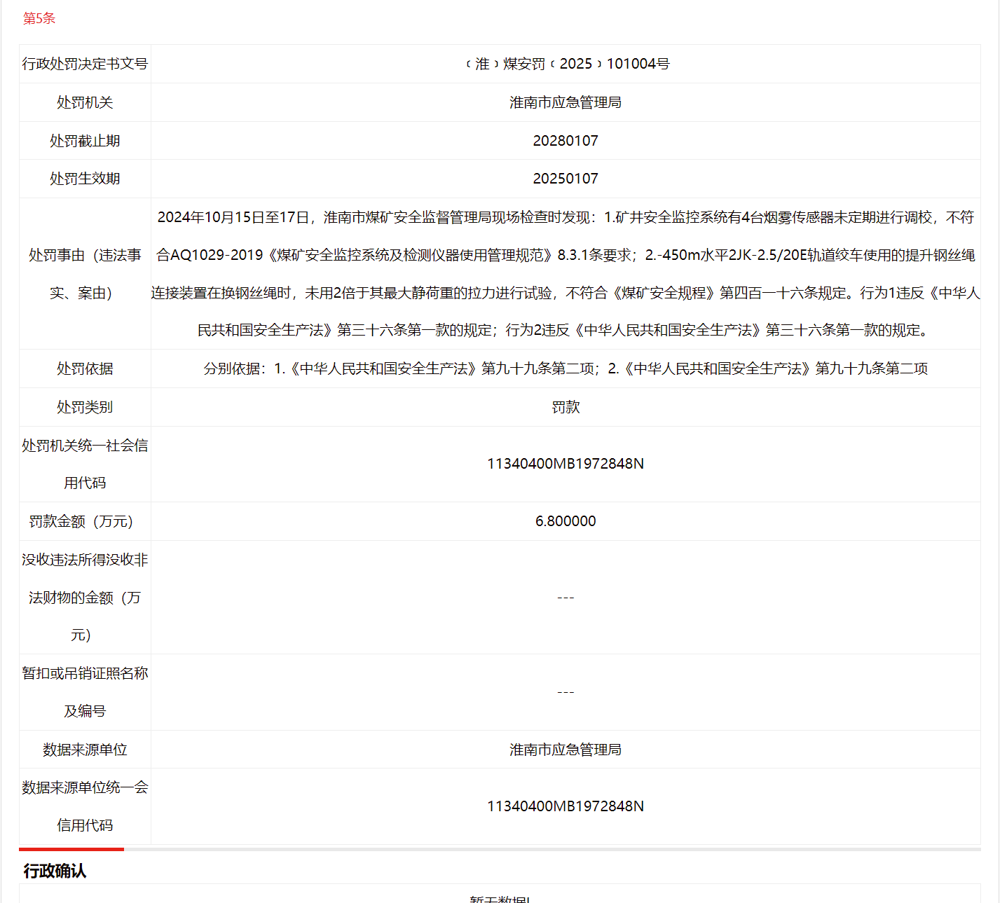 今年1月7日,该单位因涉两项安全生产违法行为,被处罚款6.8万元,行政处罚决定书文号为﹝淮﹞煤安罚﹝2025﹞101004号。