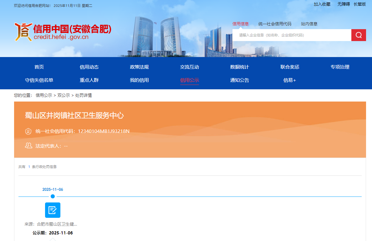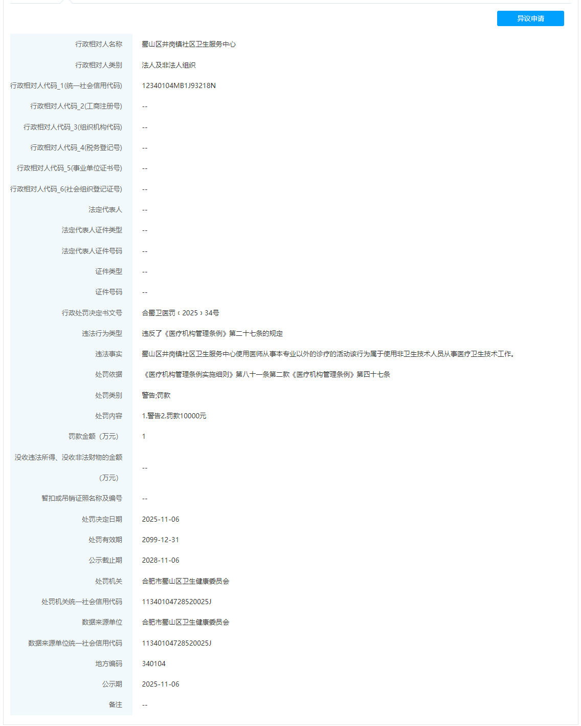 近日,信用合肥披露行政处罚信息,因使用医师从事本专业以外的诊疗的活动,蜀山区井岗镇社区卫生服务中心被罚1万元,行政处罚决定书文号为合蜀卫医罚﹝2025﹞34号。