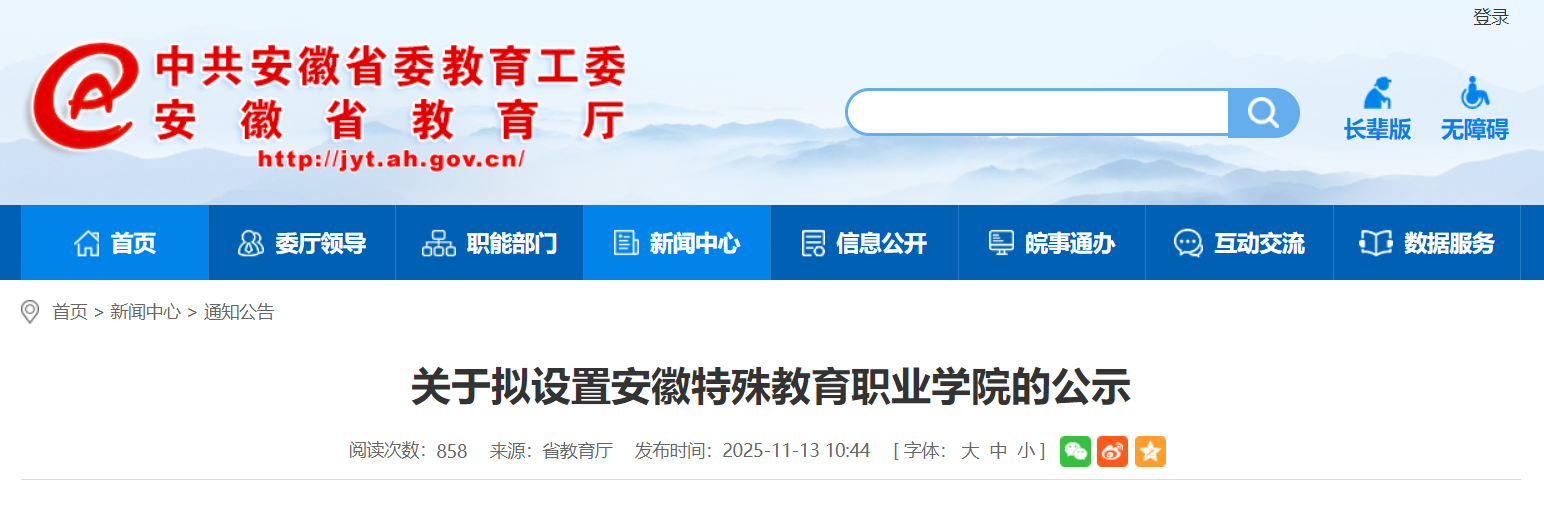 根据《中华人民共和国高等教育法》《安徽省高等职业学校设置试行办法》等有关规定,经安徽省高等学校设置评议委员会专家考察和评议,同意将“整合安徽省残联教育资源新设安徽特殊教育职业学院”报请省政府审批。现向社会公示。