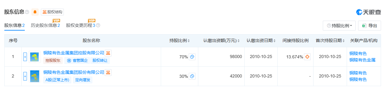 天眼查信息显示,铜陵有色金属集团财务有限公司,成立于2010年,位于安徽省铜陵市,是一家以从事货币金融服务为主的企业,由铜陵有色金属集团控股有限公司和铜陵有色金属集团股份有限公司控股,其中铜陵有色金属集团股份有限公司已在深交所上市。
