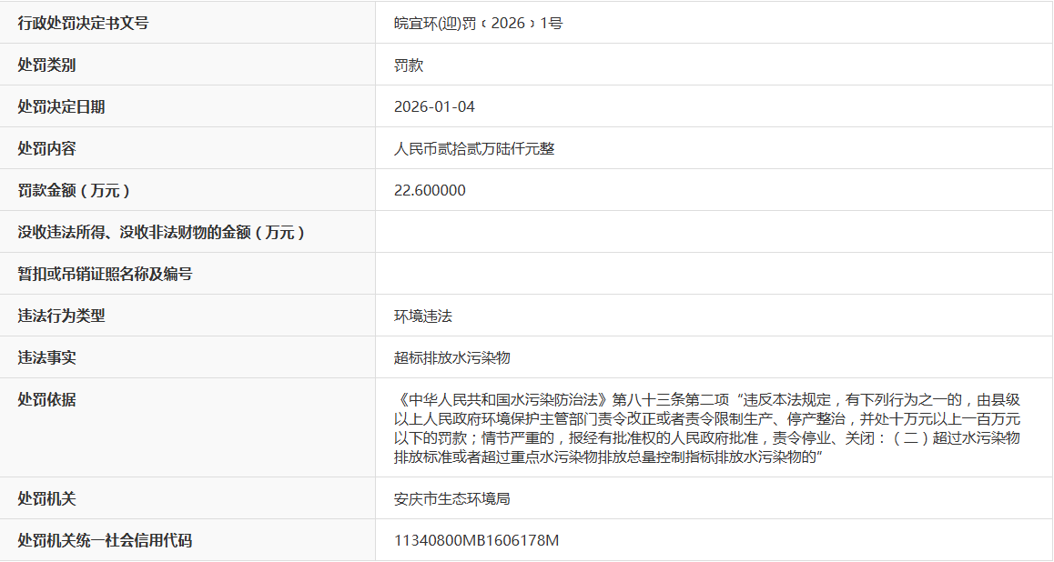 近日,据“信用安徽”公开披露行政处罚信息,因超标排放水污染物,安庆杰曼汽车科技有限公司被处以罚款22.6万元。行政处罚决定书文号是皖宜环(迎)罚﹝2026﹞1号。