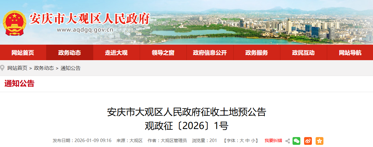 近日,安庆市大观区人民政府发布安庆市大观区人民政府征收土地预公告观政征〔2026〕1号和安庆市大观区人民政府征地补偿安置方案公告观政征〔2026〕2号。