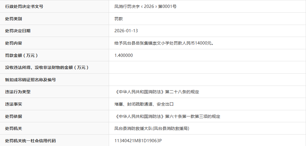 对此,依据《中华人民共和国消防法》第六十条第一款第三项的规定,凤台县消防救援大队(凤台县消防救援局)对凤台县岳张集镇崇文小学罚款1.4万元。行政处罚决定书文号是凤消行罚决字﹝2026﹞第0001号。