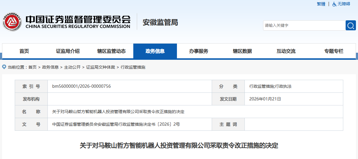1月21日,据安徽证监局消息,马鞍山哲方智能机器人投资管理有限公司因在私募基金业务活动中存在多项违规行为,受到责令改正的监管措施。