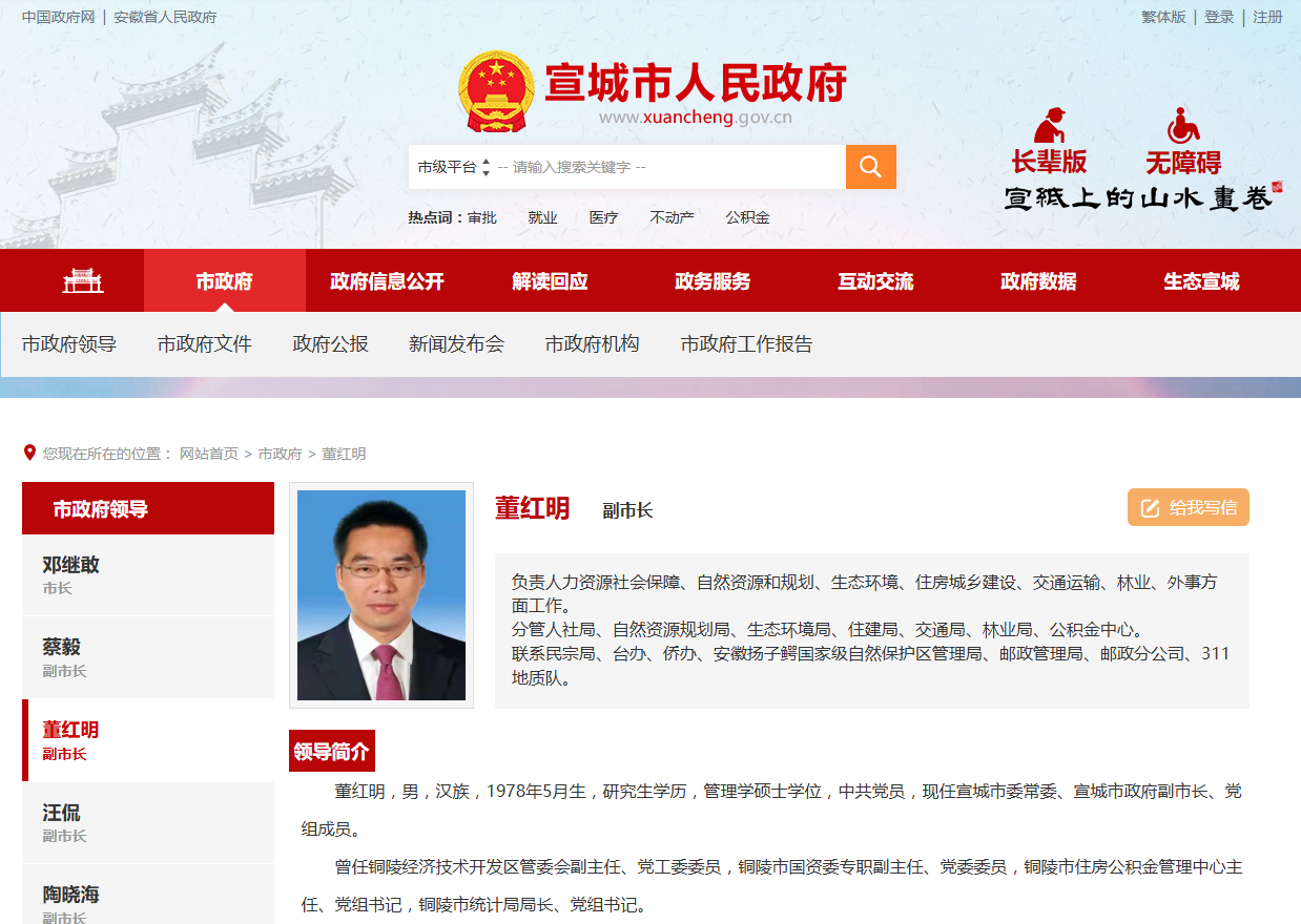 据宣城市人民政府网站“市政府领导”栏目最新显示,董红明已任宣城市委常委、宣城市政府副市长、党组成员。