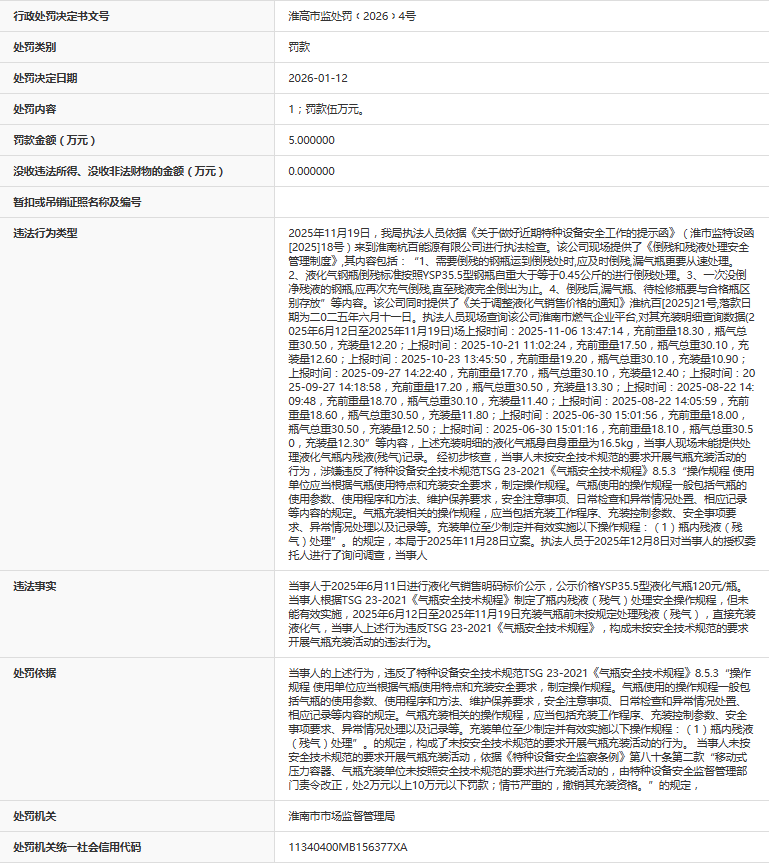 近日,据“信用安徽”公开披露行政处罚信息,因未按安全技术规范的要求开展气瓶充装活动,淮南杭百能源有限公司被处以罚款5万元。行政处罚决定书文号是淮高市监处罚﹝2026﹞4号。