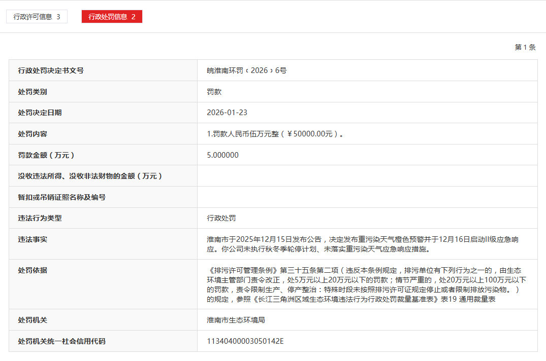 近日,据“信用安徽”公开披露行政处罚信息,因未执行秋冬季轮停计划、未落实重污染天气应急响应措施,淮南市国华建材有限公司被处以罚款5万元。行政处罚决定书文号是皖淮南环罚﹝2026﹞6号。