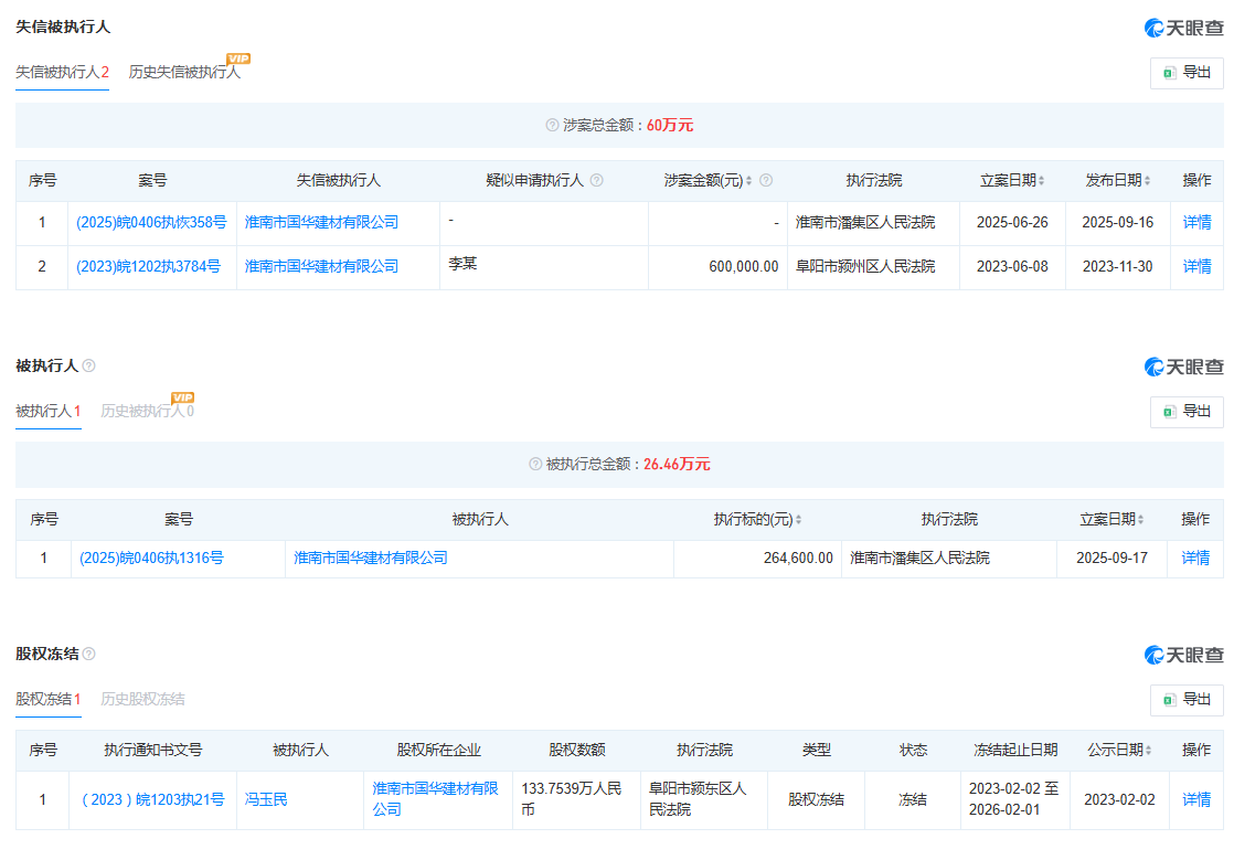 天眼查信息显示,淮南市国华建材有限公司,成立于2013年,位于安徽省淮南市,是一家以从事非金属矿物制品业为主的企业。企业注册资本3000万人民币。风险方面发现企业有裁判文书3条,开庭公告15条,立案信息1条。此前该公司已成为失信被执行人。