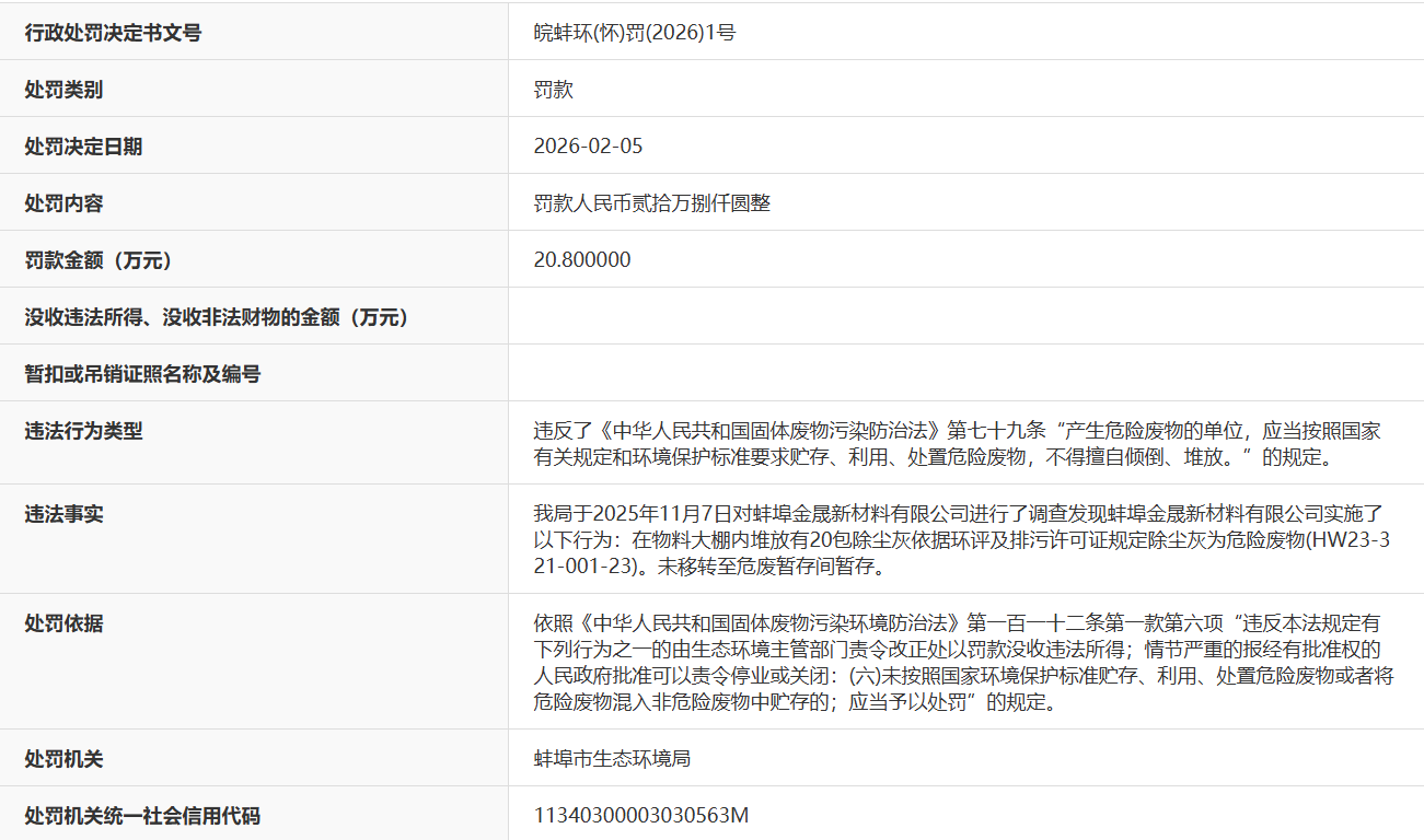 近日,据“信用安徽”公开披露行政处罚信息,因违规堆放危险废物,蚌埠金晟新材料有限公司被处以罚款20.8万元。行政处罚决定书文号是皖蚌环(怀)罚(2026)1号。
