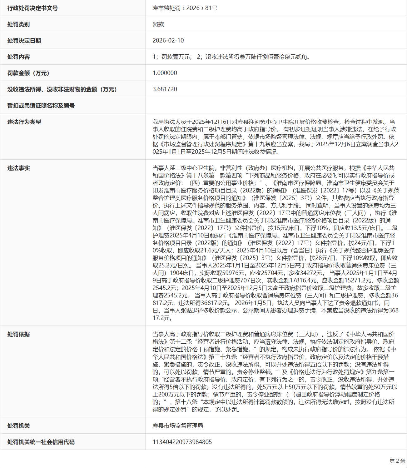 近日,据“信用安徽”公开披露行政处罚信息,因高于政府指导价收取住院费和二级护理费,寿县迎河镇中心卫生院被处以罚款1万元,被没收违法所得3.68172万元。行政处罚决定书文号是寿市监处罚﹝2026﹞81号。