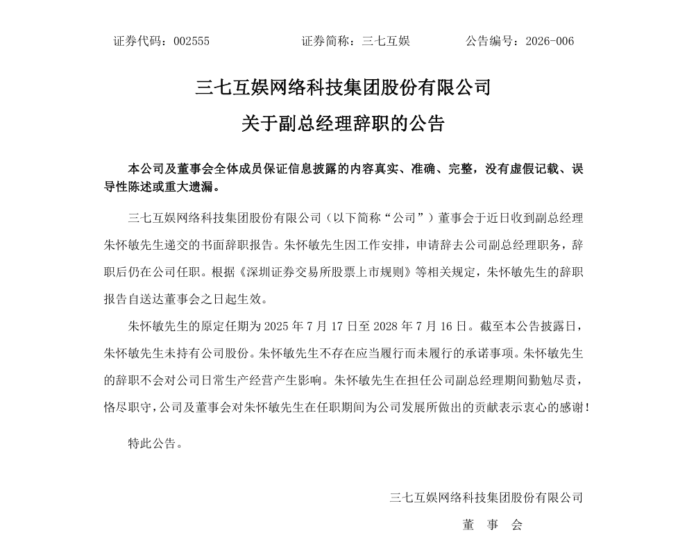 根据公告,公司董事会秘书叶威申请辞去三七互娱董事会秘书职务,辞任后仍担任董事、财务总监职务;朱怀敏申请辞去公司副总经理职务,辞任后仍在公司任职。