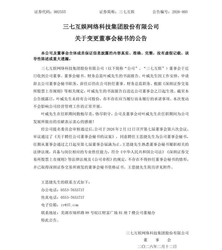 针对以上猜测,三七互娱方面未官方回应。其在公告中仅表示,本次变动不会影响公司经营管理工作的正常开展。与此同时,王思捷获委任为公司董事会秘书。