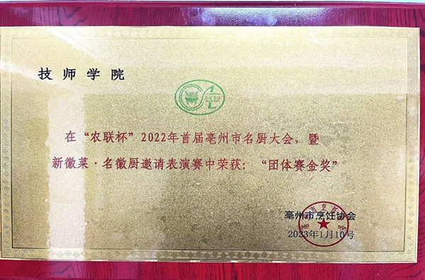 1月9日,亳州中药科技学校(安徽亳州技师学院)烹饪专业2名教师带领烹饪专业6名学生参加亳州市第一届“新徽菜·名徽厨”邀请表演赛,荣获团体赛金奖。