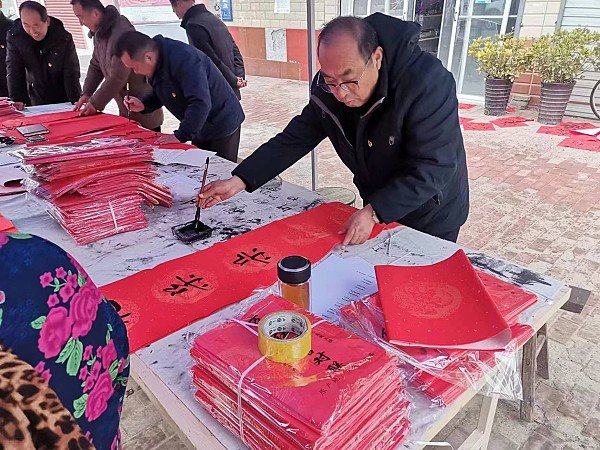 “过大年,贴春联”是中华民族的传统,象征着对美好生活的祝福,同时也能够弘扬中华传统文化,传递浓浓的年味。1月12日,农历腊月二十一,新春的脚步越来越近了,阜阳市颍东区枣庄镇教育党总支组织数位书法老师走上枣庄镇街头开展了红红火火的写春联送祝福活动。