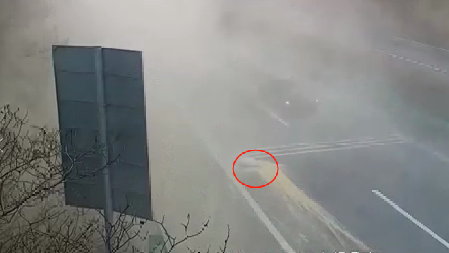 警觉的民警立即通过视频寻找,发现在该车后方的路面,洒落着几包货物,被后方驶过车辆碾压后出现破损,形成大量 “烟雾” 状粉尘,严重影响行车视线。