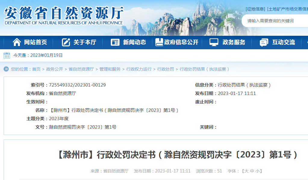 近日,安徽省自然资源厅网公布行政处罚决定书(滁自然资规罚决字〔2023〕第1号)。