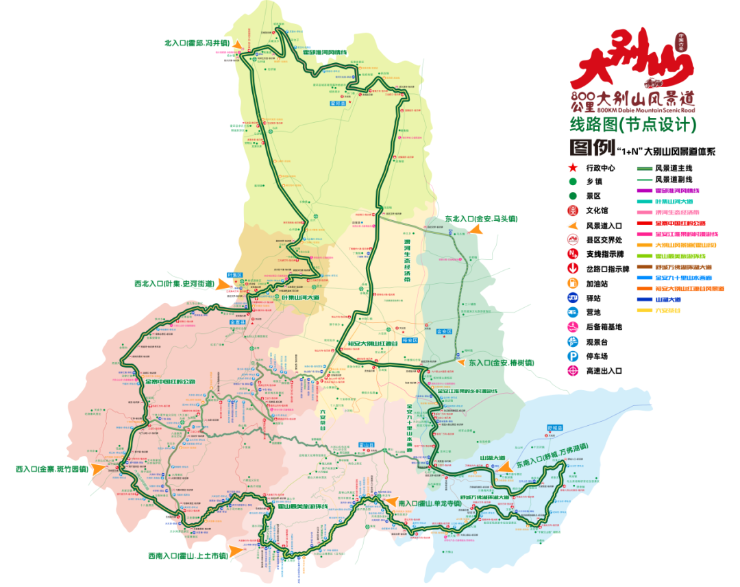 800公里大别山风景道是文旅、农旅、交旅、商旅融合示范基地,融合推进“1+N”大别山风景道体系建设,包括金寨中国红岭公路、霍山最美旅游环线、舒城万佛湖环湖大道、金安九十里山水画廊、裕安红源谷风景道、霍邱淮河风情线、叶集山河大道七条支线,其中金寨“中国红岭公路”荣获2020年度中国“十大最美农村路”、“2020年中国体育旅游十佳精品线路”,并和大别山风景道(霍山段)并列入选首批8条省级旅游风景道。