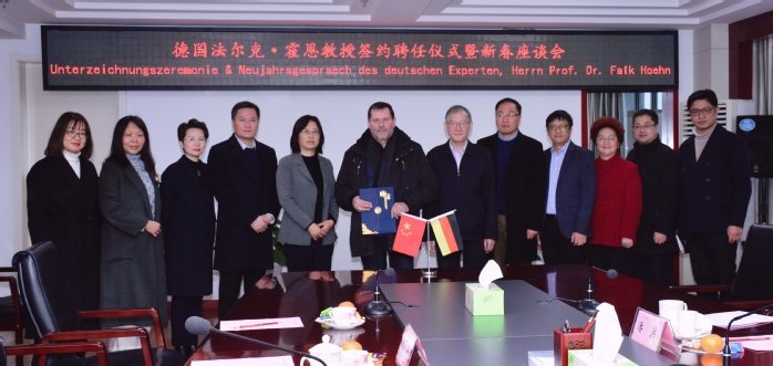 2月10日上午,合肥学院在行政楼九楼东会议室举办外籍教授聘任仪式暨新春座谈会,来自德国汉诺威应用科学大学的法尔克·霍恩受聘为学校外籍教授。合肥学院党委书记王其东、院长吴春梅出席仪式,组织部、教务处、人事处、国际交流合作处、研究生处、设计学院、外国语学院等相关单位负责人参加仪式。王其东给霍恩教授颁发聘书,人事处处长纪平代表学校与霍恩教授签订聘任协议。