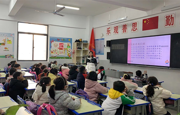 班会课上,班主任老师通过引导队员观看校园图片,激发队员爱学校的热情;通过回答问题进一步认识自己的学校,激发学生主人公的意识;通过游戏抢答,让学生联系实际生活,想一想应该怎样爱护校园;在小组讨论中,师生共同梳理汇总校园存在的问题,让学生发现校园生活中存在的不文明行为,并勉励大家向文明的行为看齐,做文明的小学生。