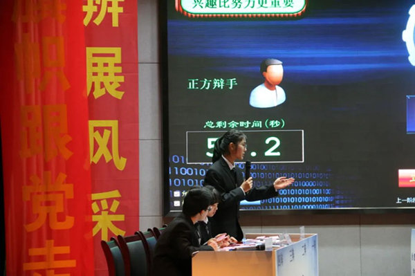 西园校区辩论队的观点是“在学习上,兴趣比努力更重要”。文采飞扬的开场白后,我方就与反方辩手展开激烈的交锋。一辩沈若兰娓娓道来,观点明确,立论中阐述了兴趣对于学习的内驱力,持久力和引导力,并提出我方判标。二辩丰睿洋抽丝剥茧,鞭辟入里,多角度多方面地反驳了对方立论中的要害,同时强有力的重申了我方观点。三辩熊梓淇能言善辩,口若悬河,面对对方辩友的问题反应迅速,回答问题有条不紊。四辩朱立成语惊四座,才辩无双,强有力地驳斥了对方观点,为观众呈现了一个近乎完美的总结。