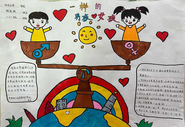 各年级以“性别平等,共筑和谐”为主题绘制了精美的手抄报,表达了孩子们对性别平等的独特理解。一幅幅作品,色彩艳丽,布局饱满,书写美观,想象力丰富,让男女平等基本国策深入每个孩子心里。
