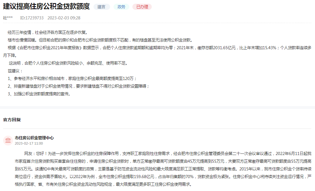 近日,有网友在人民网留言,建议合肥提高住房公积金贷款额度,家庭住房公积金最高额度提高至120万元,同时建议要求新建楼盘不得对公积金贷款设置障碍等。