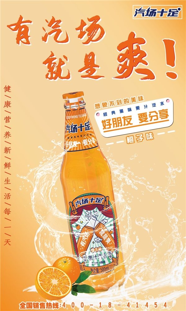 汽场十足果味系列果味汽水将果汁与汽水结合,既有着水果的香甜,又带有汽水的清爽,口感独特,动力十足,更加过瘾,遵循“安全、营养、卫生”的原则,甄选新鲜水果,通过先进工艺榨取水果原汁,保证了产品品质。