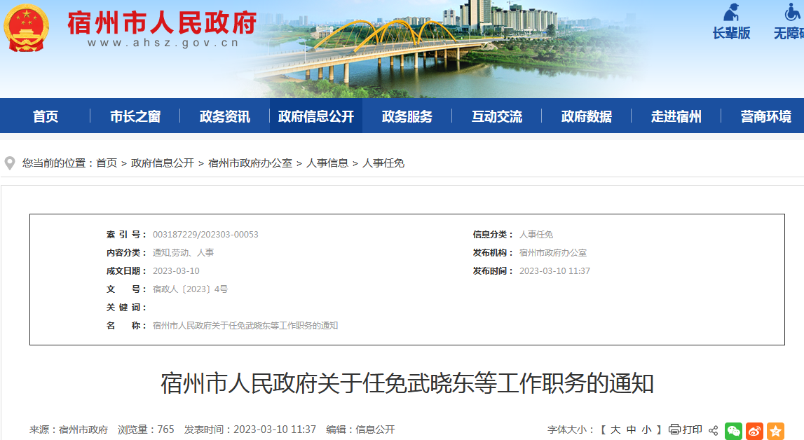 据宿州市人民政府官网3月10日消息,近日,宿州市人民政府发布通知,任免一批干部。