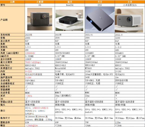 总是觉得家里电视看起来有点小了,想要个更大的屏幕看起来更爽。听朋友介绍投影仪能投更大屏也更适合年轻人,所以专门去做了功课。看了几款3千价位的投影仪,最后在大眼橙 X6、极米 NEW Z6X、当贝 D5X和小米投影仪2S这四款进行选择。