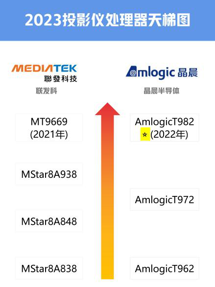 三、性能方面:这几款投影仪使用到三款芯片,分别为大眼橙 X6和小米投影仪2S使用的Amlogic T982、极米 NEW Z6X使用的Mstar6A848和当贝 D5X使用的MT9669。对比下图,我们也可以看到这四款使用到最好的处理器芯片就是MT9669和AmlogicT982了,并且Amlogic T982也是去年刚刚上市的芯片。