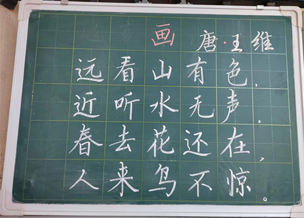 本周展出的粉笔字内容是古诗《画》。老师们的书法风格各有千秋,作品或清秀隽美、大方得体;或刚劲有力、提按分明;或行云流水、潇洒飘逸;或结构严谨、形神兼备;或端正秀丽、圆转流美。一份份作品充分展示了教师扎实的基本功和专业的书写水平,展现了教师严谨治学、积极进取的教育初心。