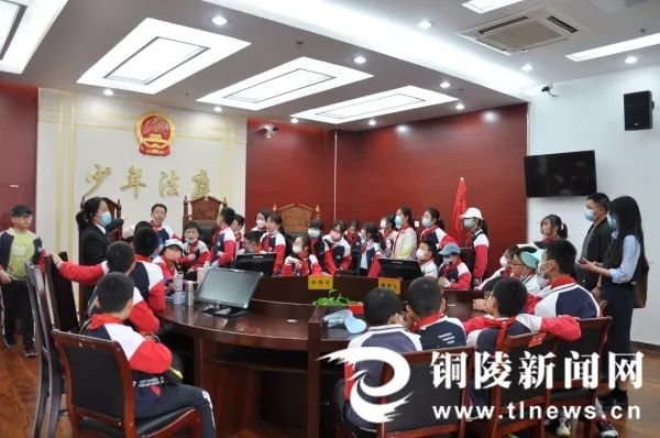 日前,铜陵市铜官区人民法院举办法院开放日活动,邀请市天津路小学50余名师生走进法院,让学生们零距离“沉浸式”感受法院文化,在他们心间播撒法治种子。(杨竹青)