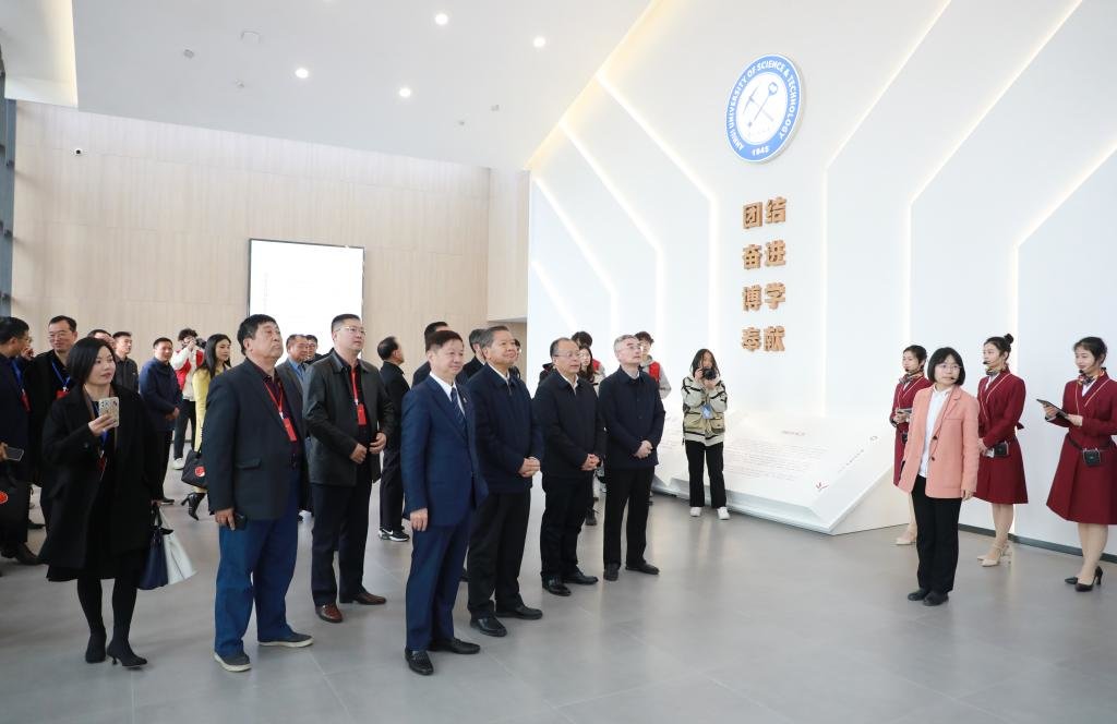 郭永存致辞。他代表安徽理工大学向参与校史馆筹建和关心支持校史馆建设的单位、个人等表示衷心的感谢!向来校参加开馆仪式的领导、嘉宾以及校友们表示热烈的欢迎!郭永存指出,校史馆从筹备到建设再到开馆,领导小组、承建单位克服时间紧、任务重、疫情形势反复变化等多重阻力,倒排工期、挂图作战,加班加点、攻坚克难,如期完成设计、建设和布展等任务,这种不畏困难、积极向上的精神状态,正是安理精神的鲜活体现。如今,校史馆的顺利落成并对外开放不仅为安理人构筑了一处精神文明“新高地”,也为淮南市增添了一处历史文化“新坐标”。他强调,校史馆今后要继续发挥好三方面的作用,一要以史明理,更加重视对校史的学习和对办学经验的总结,充分利用校史馆展示、宣传、教育等综合功能,引导师生医务人员从前辈们筚路蓝缕的创业历史中汲取智慧和力量,守正创新、团结奋斗。二要以史增信,常态化使用好、管理好校史馆,把参观校史馆作为校友返校的“打卡点”,作为入学教育和岗前培训的“必修课”,作为思政课建设的“主阵地”,不断增强安理人的认同感、归属感和使命感。三要以史力行,要深刻认清新时代高等教育发展形势和安徽理工大学所处的方位,把总结经验、观照现实、推动工作结合起来,汇聚起奋进新征程、建功新时代的精神力量,创造属于我们这一代人的新成就。
