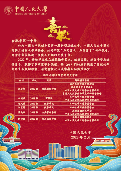在这份喜报上,合肥一中毕业生拿到的奖项都含金量十足,涵盖了本科生国家奖学金、社会工作与志愿服务骨干奖学金、优秀班团骨干奖学金、中国人民大学三好学生荣誉称号、本科生学习优秀特等奖学金(京东奖学金)、中国人民大学优秀学生干部荣誉称号、本科生学习优秀奖学金等。