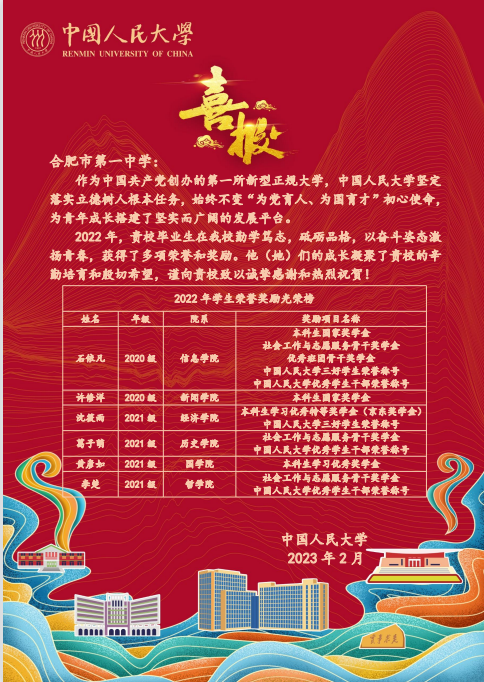 近日,合肥一中收到来自中国人民大学的喜报。在喜报中,中国人民大学对合一学子的在校表现不吝溢美之词,称赞合一学子勤学笃志,砥砺品格,以奋斗姿态激扬青春,获得了多项荣誉和奖励。同时,也对合肥一中给予他们成长的辛勤培育表示感谢,并对他们的获奖表示祝贺!