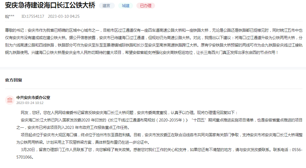 安庆市委高度重视,回复如下: 安庆海口长江大桥已列入国家发改委2020 年印发的《长江干线过江通道布局规划(2020-2035年)》“十四五”期间重点推进实施项目清单,也是安徽省重点推进的项目之一,安庆市已将该项目列入2023 年市政府工作报告重点工作任务。