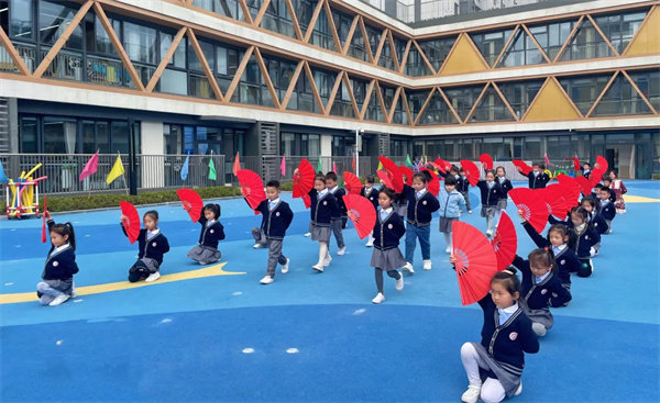 瞧!大班的小朋友们踏着整齐有力的步伐出场了。他们在老师的带领下精神饱满、动作娴熟、富有激情地做着每一个动作。孩子们手中高举的红扇在中国风乐曲的衬托下,彰显出非凡的气势,整齐划一的动作更是让人眼前一亮。