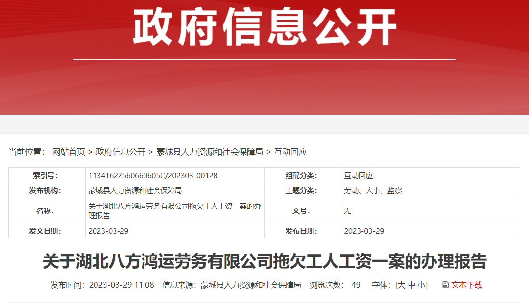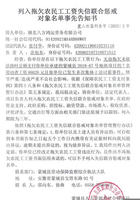 针对湖北八方鸿运劳务有限公司拖欠工人工资且在整改期后仍未支付的行为,蒙城人力资源和社会保障局前日依法对其做出了罚款和列数失信联合惩戒对象名单的处理决定。