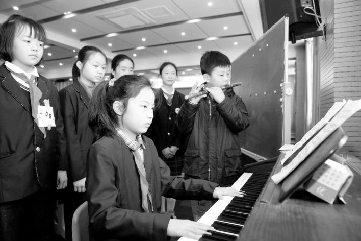 3月31日,铜陵市翠湖小学学生以奏乐的方式吟诵古诗词。据了解,为弘扬中华文化,提高学生人文素养,该校开展“诵中华经典诗词,做翠湖出彩少年”赛诗会活动,吸引众多学生参与并一展风采。(潘伟)